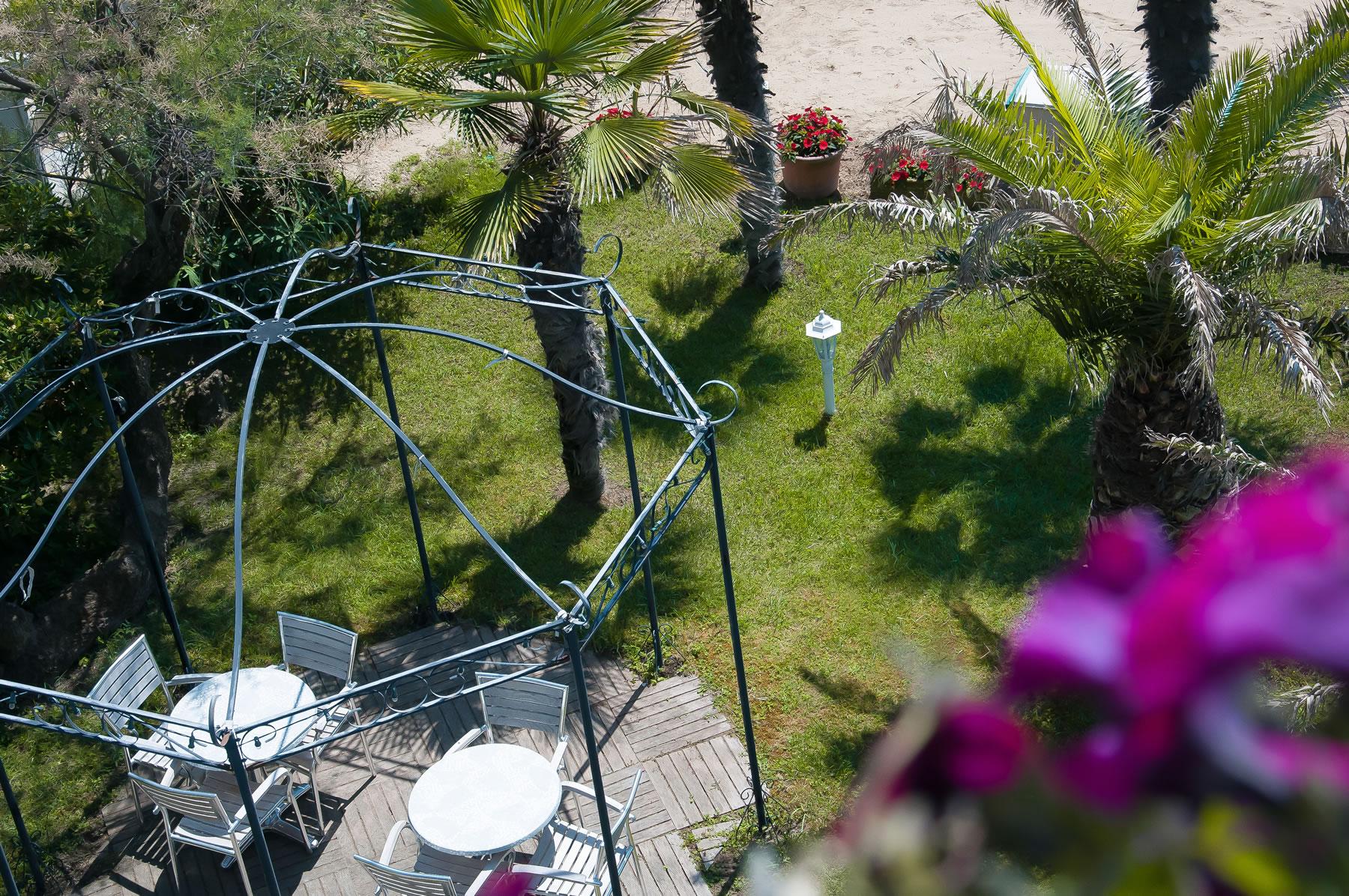 Looking for some rest after the sun? You can make yourself perfectly comfortable and still use our free wi-fi connection in the cool of our green oasis, surrounded by its colourful flowers, green palms and shadowy pine trees.